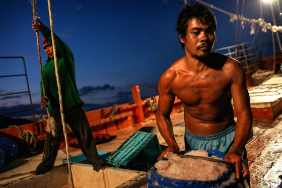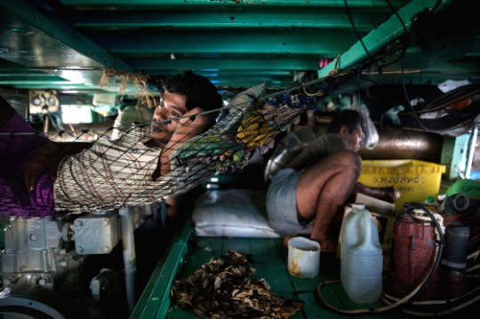 Sur les bateaux de pêche, ces travailleurs n’ont pas même pas accès aux soins médicaux de base pour traiter les blessures ou les infections. Ils travaillent 16 heures par jour, sept jours sur sept et endurent la privation de sommeil. Ils manquent de choses basiques comme l’eau potable, la douche ou une nourriture décente.