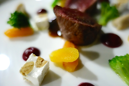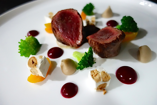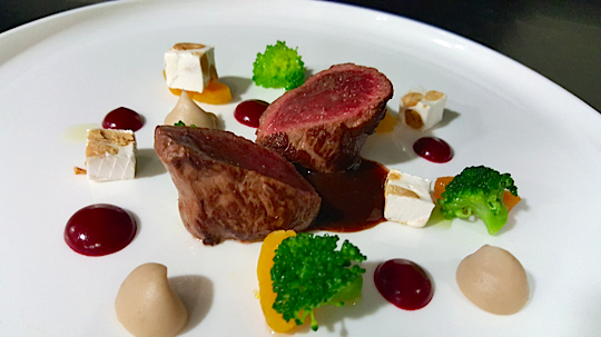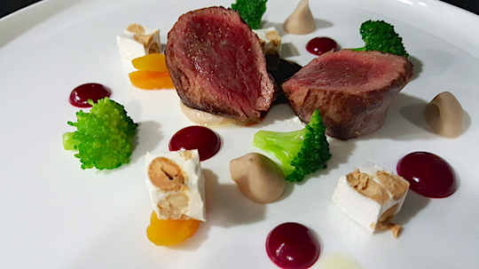 Recette 10 – Noisette de chevreuil rôtie, airelles et châtaignes, nougat et abricot sec, jus façon poivrade